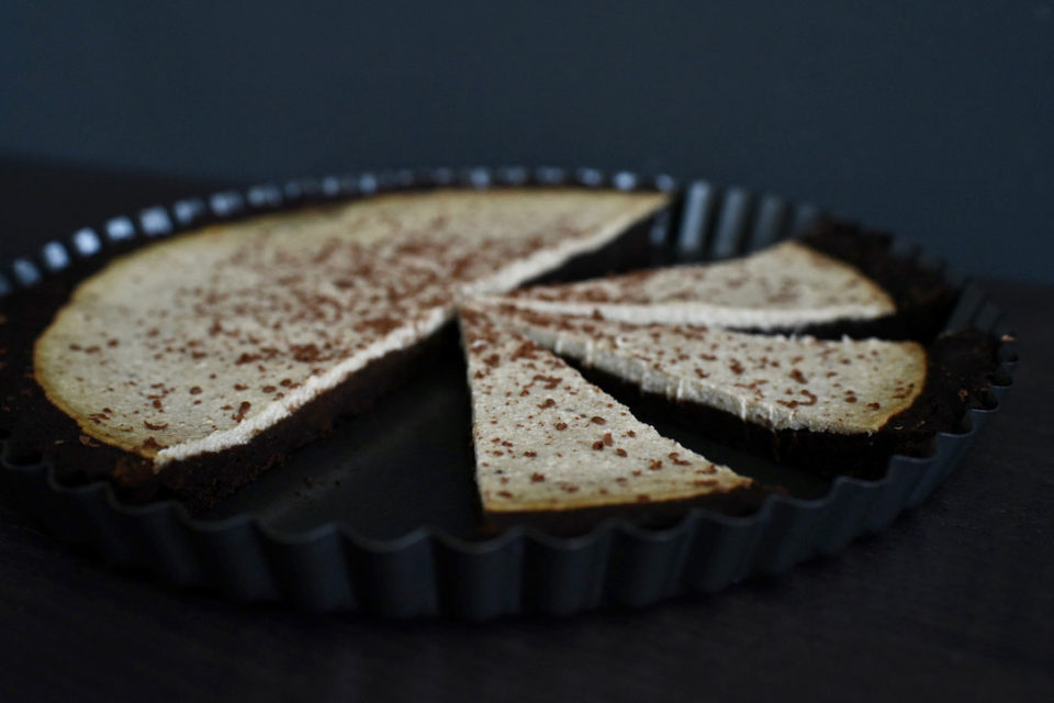 Okrúhlu formu (priemer 28 cm) vymastím maslom (príp. vysteliem papierom na pečenie) a rovnomerne rozložím čokoládovú hmotu. Urobím trochu vyvýšené okraje. Navrch rozotriem tvarohovú hmotu. Pečiem pri 180 stupňoch 30-35 minút. Na vychladený koláč nastrúham čokoládu.