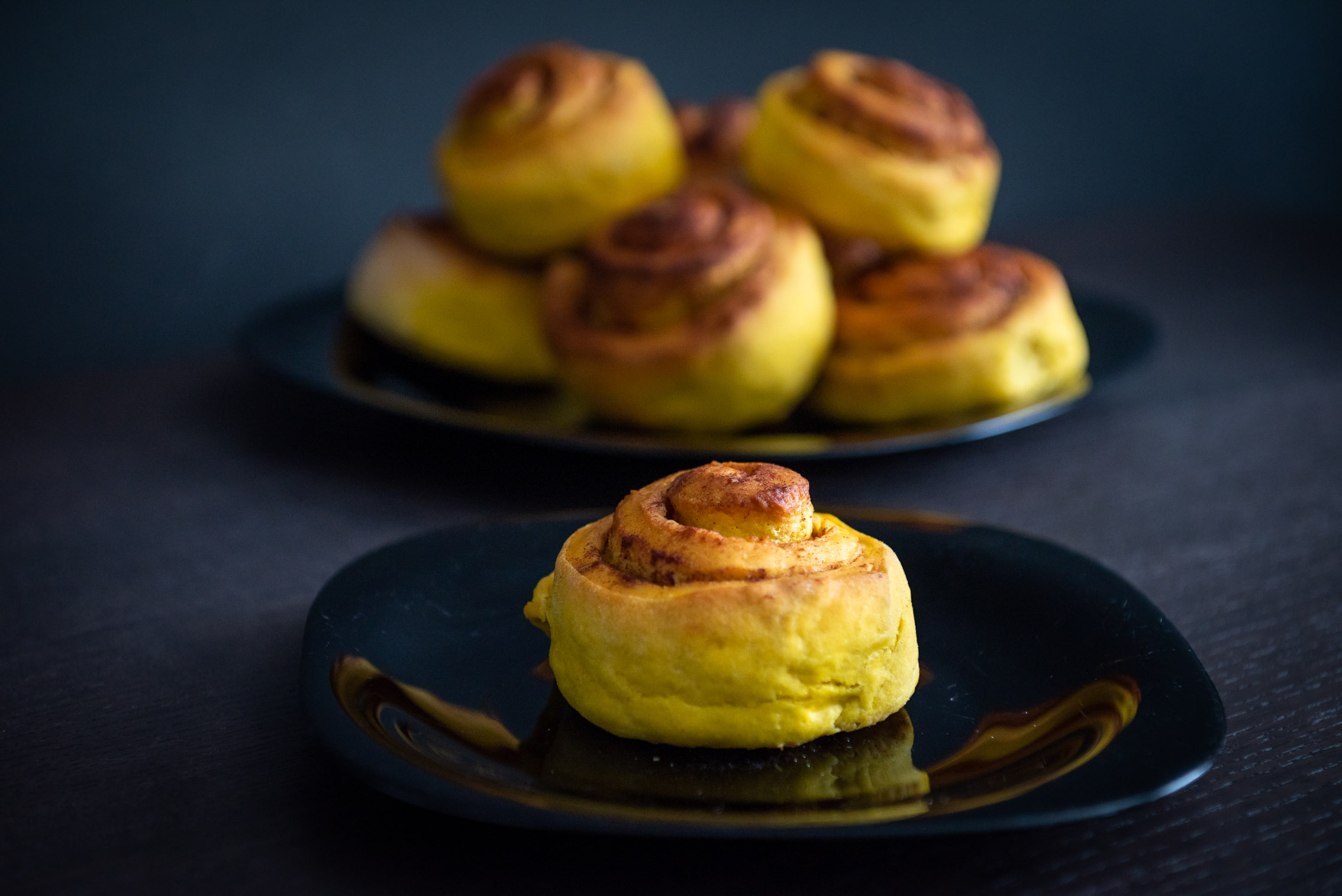 Do kvásku pridám mlieko s roztopeným maslom, vajíčko, štipku soli, hokkaido, miesim a postupne pridávam múku. Ak by bolo cesto príliš lepivé, pridám viac múky. Vymiesim hladké cesto, nechám nakysnúť (pokiaľ zdvojnásobí objem). Cesto rozdelím na polovicu. Každú vyvaľkám na tenký obdĺžnikovitý plát. Potriem roztopeným maslom, pokvapkám medom (následne ho rozotriem), posypem škoricou.