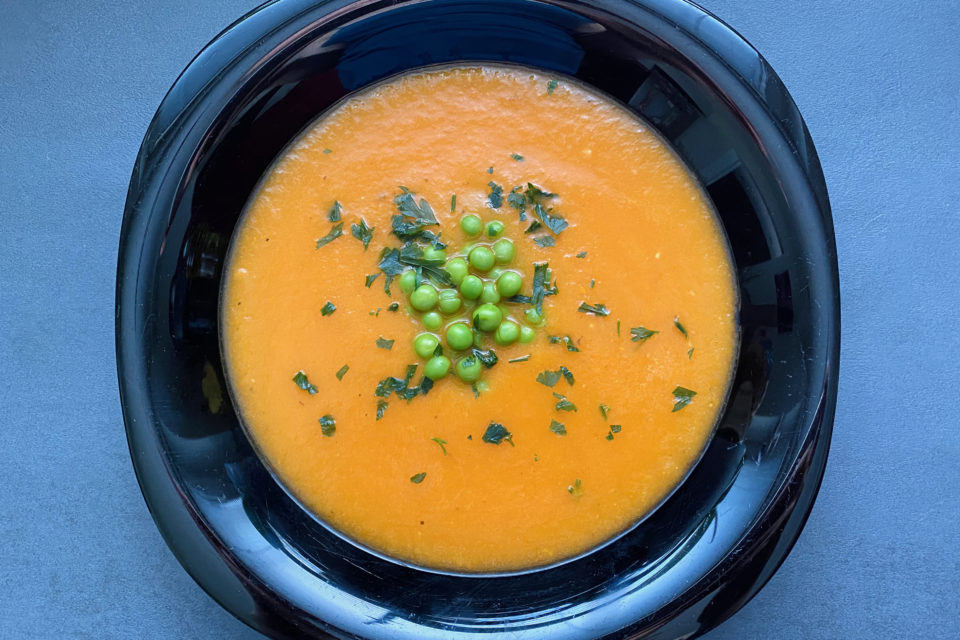 Zeleninu podlejem passatou a dolejem vodu. Varím približne 20 minút do zmäknutia zeleniny. Polievku rozmixujem do hladka (časť hrášku vyberiem na ozdobu).