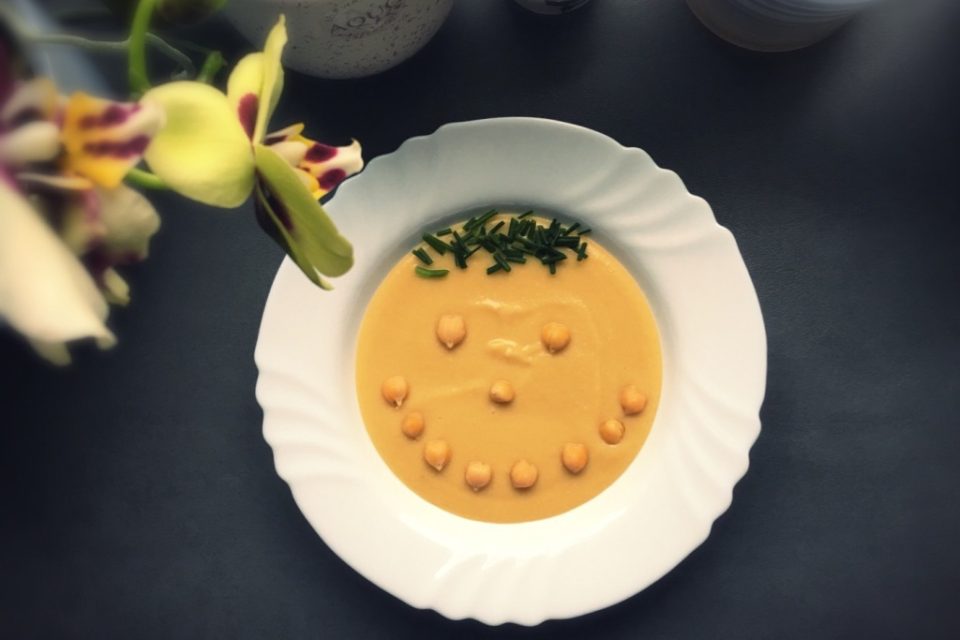 Zeleninu pridám k cíceru a varím ďalších 25-30 minút do zmäknutia zeleniny a cíceru. Rozmixujem dohladka (niekoľko kúskov cíceru nechám na ozdobu). Podávam s petržlenovou vňaťou alebo pažítkou.